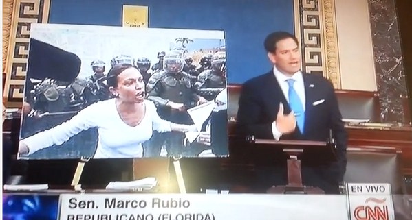 La primera fotografía que mostró el senador por Florida fue la del dirigente opositor Leopoldo López cuando era apresado por la GNB en Caracas. Denunció que fue detenido solo por protestar contra el Gobierno de Maduro y calificó a los funcionarios venezolanos como unas “marionetas” de La Habana. Añadió que agentes militares cubanos están infiltrados en este país a cambio del petróleo barato y gratis que se le provee.